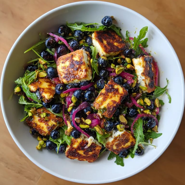 Save to Pinterest Blueberry and Burnt Halloumi Crunch brings together salty cheese with the pop of blueberries, zippy pickled onions, and a drizzle of homemade blueberry glaze for a salad you will crave all season. Perfect for feeding friends at brunch or adding a colorful spotlight to weeknight meals, this is a dish you reach for when you want flavor that surprises in every bite.