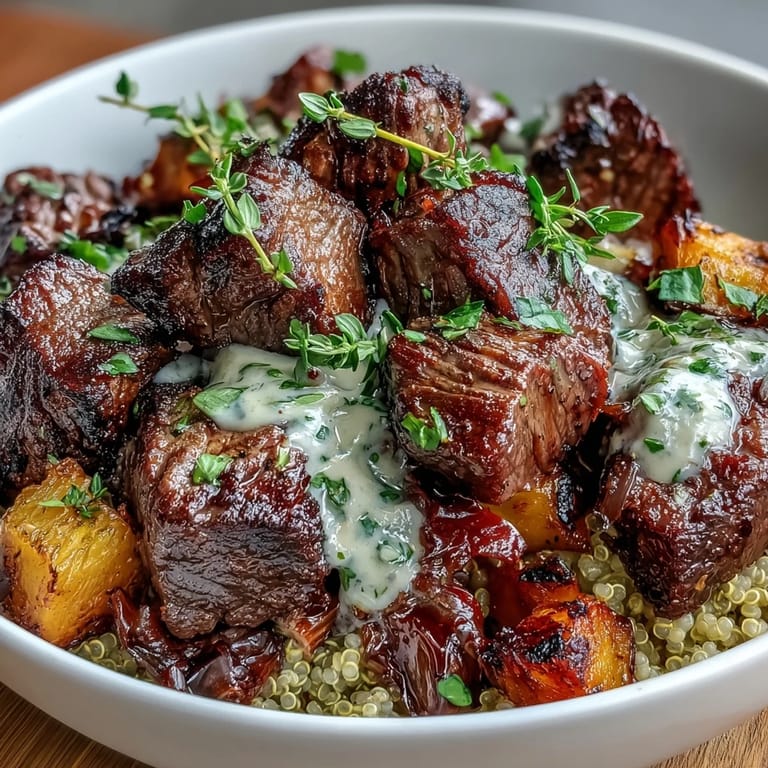 - Divide the fluffy quinoa among four bowls, then top each with roasted butternut squash and steak bites arranged however feels right. Drizzle the garlic herb sauce generously over everything—don't hold back here.