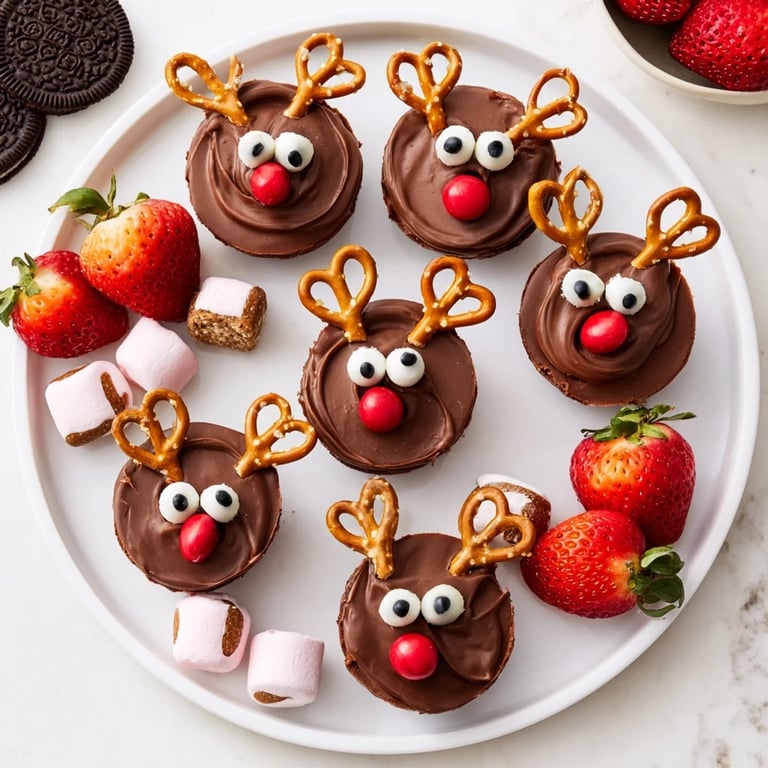 Save to Pinterest A whimsical and festive dessert board featuring chocolate pudding cups decorated as reindeer, surrounded by an array of delicious treats&mdashperfect for holiday gatherings or family fun.