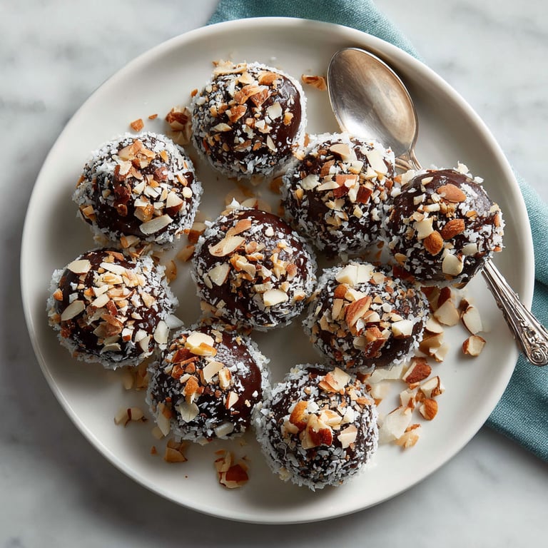 - Spread out the chopped almonds on a plate. Roll each truffle in the almonds until fully coated on all sides, pressing gently so the nuts stick well. Arrange finished truffles on a clean plate or baking sheet.