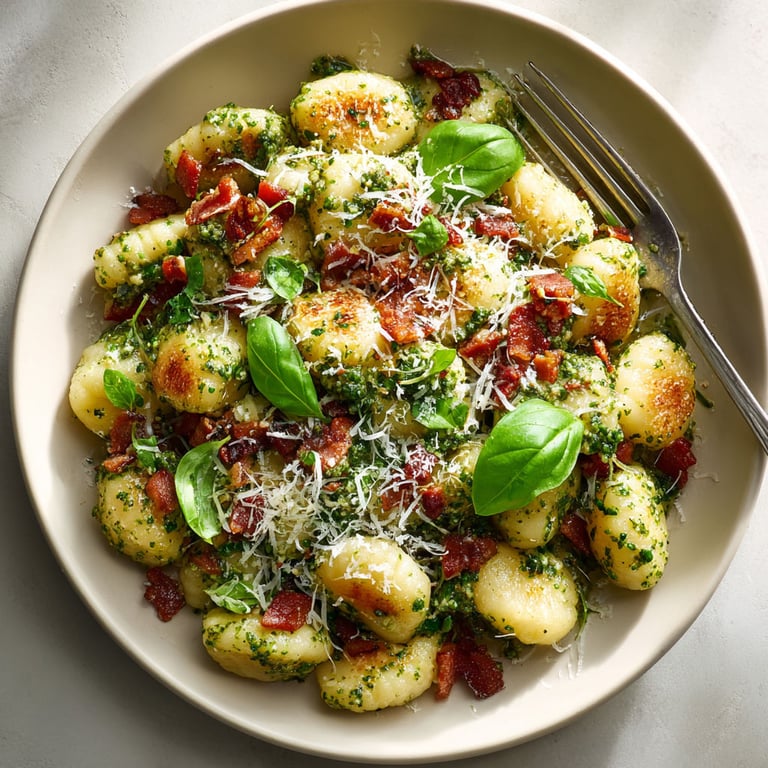 Save to Pinterest Creamy pesto gnocchi with pancetta is the kind of weeknight comfort you turn to when you need something both fast and deeply satisfying. Soft, pillowy potato gnocchi gets swirled into a basil pesto cream sauce then tossed with crisp pancetta. Each bite is rich and savory with a touch of freshness from the pesto and basil. This is seriously one of those meals that makes being at home feel like a treat.