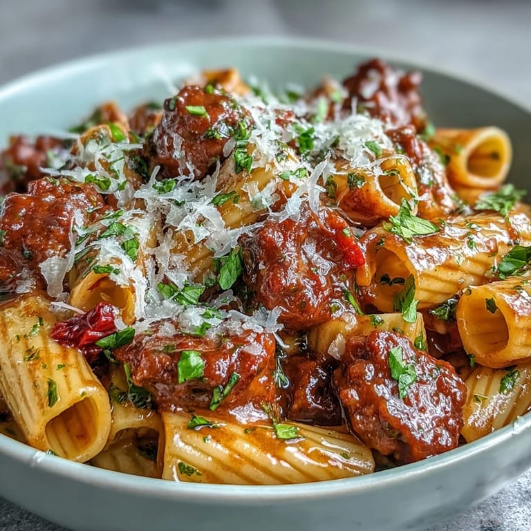 Save to Pinterest My neighbor knocked on my door one Tuesday night holding a bottle of red wine she couldn't finish alone. I had sausage thawing, a box of penne in the pantry, and no plan whatsoever. What came out of that pot thirty minutes later tasted like I'd been simmering it all day. The wine didn't just add flavor, it loosened everything into this glossy, brick-red sauce that clung to every ridged edge of pasta. We ate it straight from the skillet with two forks and decided some of the best meals happen by happy accident.