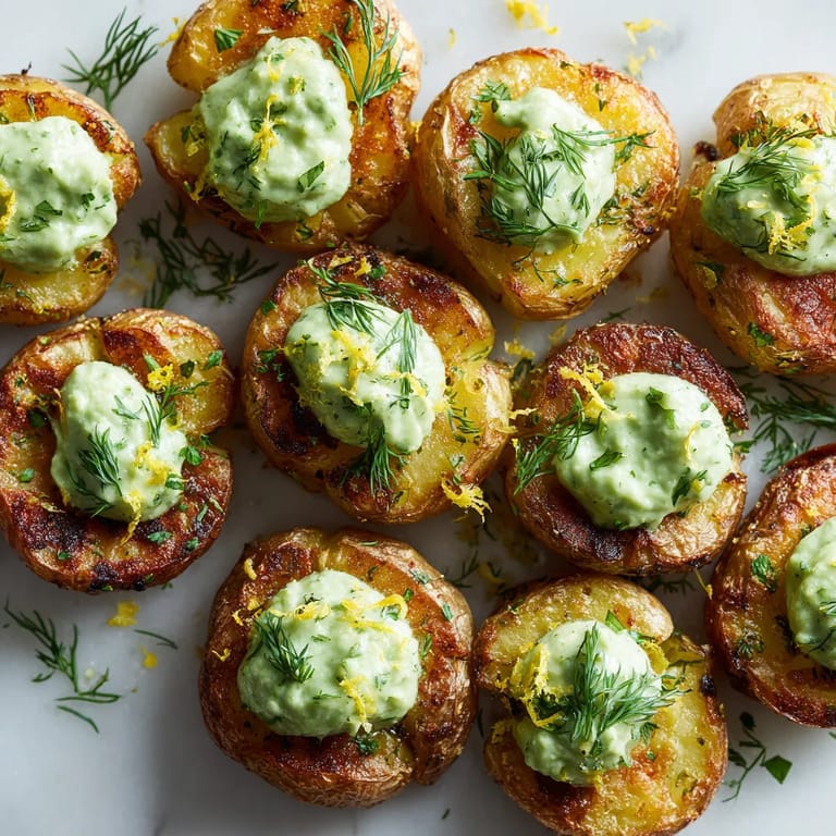 Save to Pinterest Crispy smashed baby potatoes finished with a lush and herby avocado-dill Green Goddess sauce have become a fresh staple for our spring and summer gatherings. This recipe brings out the best of seasonal herbs and delivers a side dish or appetizer everyone gets excited about, thanks to its vibrant flavors and creamy topping.
