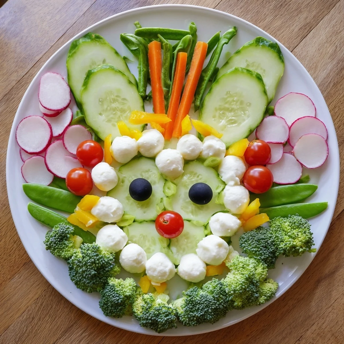 Use cucumber rounds to form the bunny's face and ears. Fill the face with cauliflower and mini mozzarella balls to add fluffiness. Use cherry tomatoes for cheeks, black olives for eyes, and bell pepper strips for the mouth and whiskers.