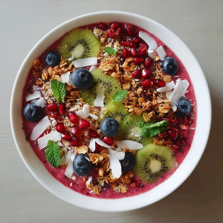 This bowl is best eaten immediately because the smoothie base can melt quickly once topped. But if you need to prep ahead you can blend the base and keep it tightly covered in the fridge for up to four hours. Add toppings just before serving so they stay crisp. If you want to freeze blend the base and freeze it in a single layer then break into chunks and reblend before serving.