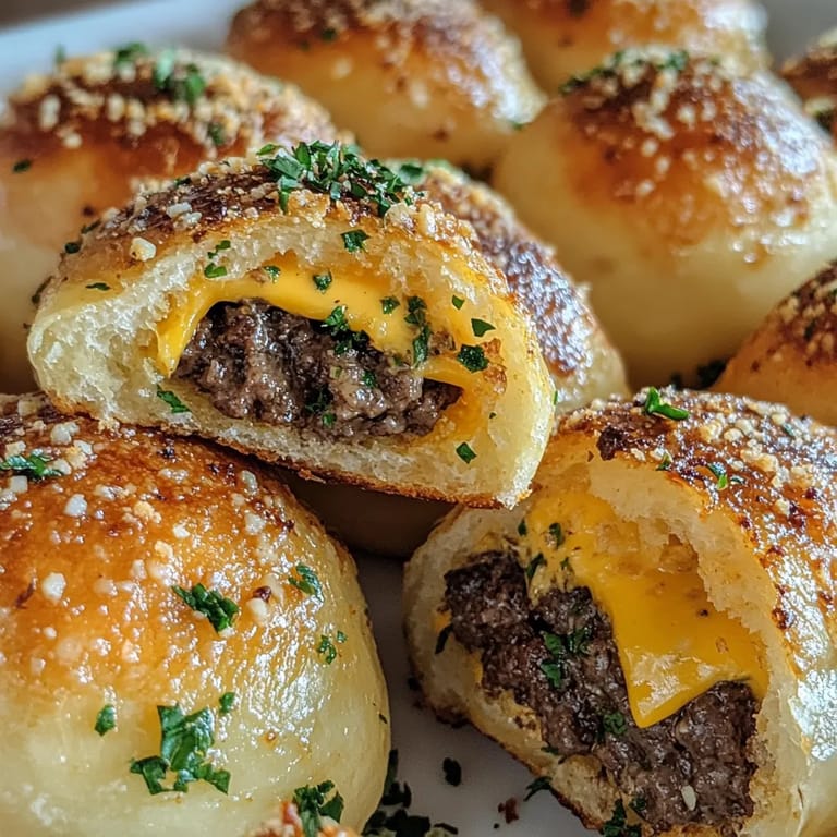 Save to Pinterest These savory Garlic Parmesan Cheeseburger Bombs transform classic burger flavors into bite-sized pockets of pure comfort food bliss. Each golden-brown bomb delivers a perfect bite of seasoned beef and melty cheese wrapped in soft, buttery biscuit dough and topped with a garlic parmesan crust that adds irresistible flavor.