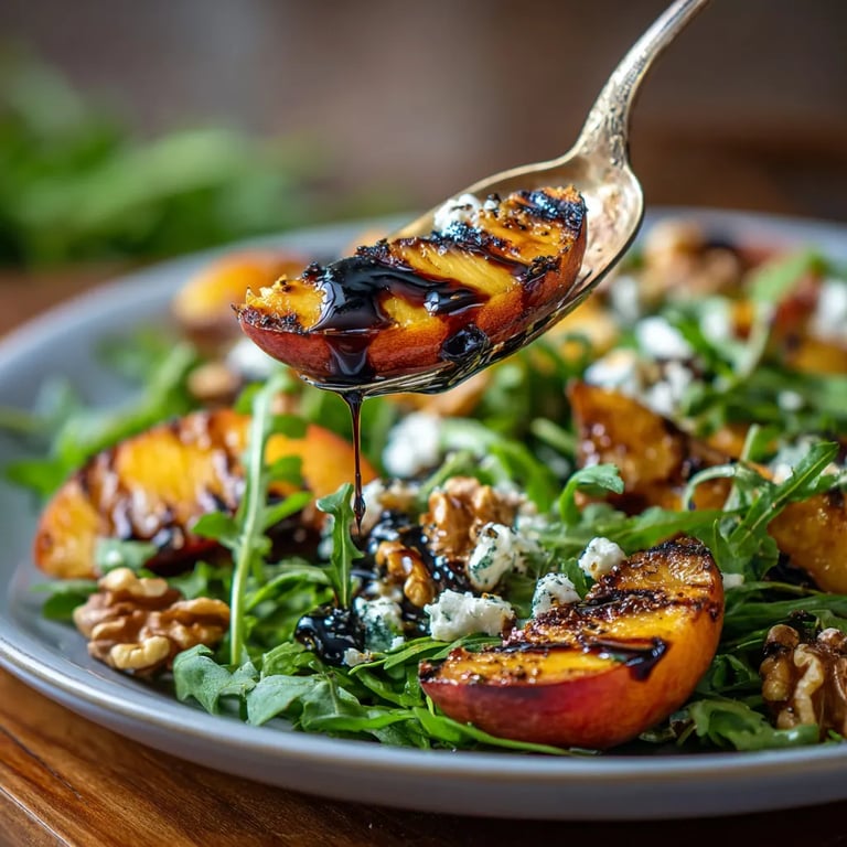 Save to Pinterest Juicy grilled peaches bring a burst of summer sweetness to this vibrant salad while creamy feta and crunchy walnuts create a perfect counterpoint in every bite The drizzle of balsamic glaze ties it all together with a tangy finish making this dish irresistibly fresh and easy enough for any weeknight or backyard gathering