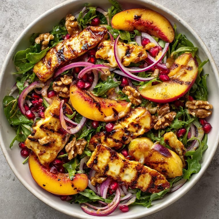 - Arrange your greens on a wide platter or in a large bowl. Distribute the grilled peach wedges and halloumi pieces evenly over the leaves. Scatter the thin red onion slices and pomegranate seeds for a burst of flavor. Drizzle the sumac dressing all over your salad so every bite gets coated.