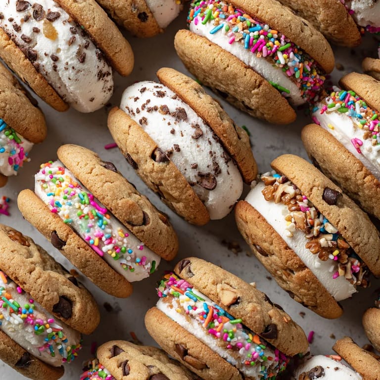- With the ice cream still soft, roll the edges of each sandwich in your favorite mini chocolate chips, rainbow sprinkles, or chopped nuts, gently pressing so they stick.