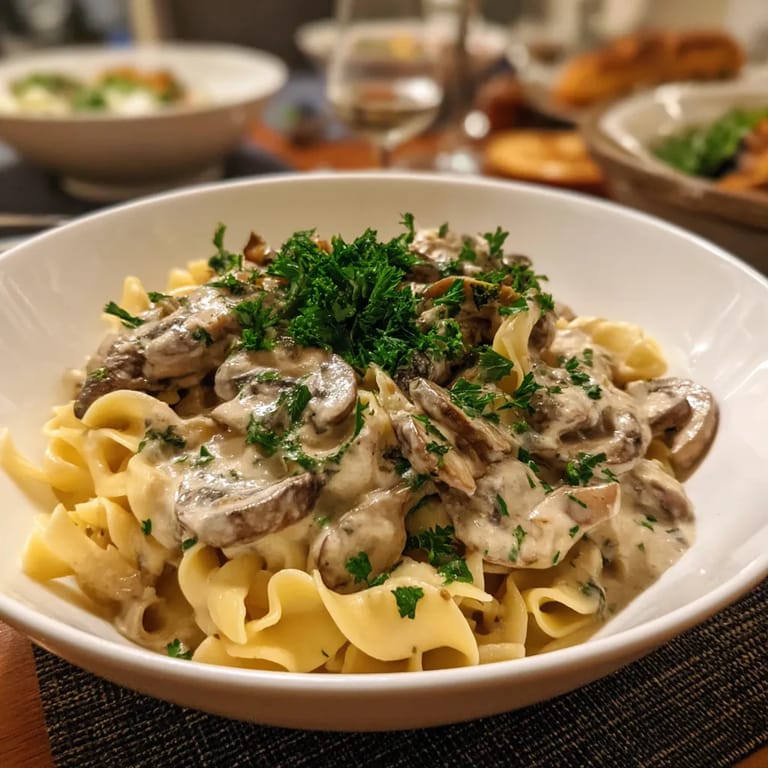 Save to Pinterest Mushroom Stroganoff brings together tender mushrooms and rich, creamy sauce with just enough herbs to make every forkful lush and satisfying. It is my go-to when everyone needs comfort food but we are in the mood for something lighter than beef. You can whip this up quickly on a weeknight or make a double batch to serve company—either way, no one will miss the meat.