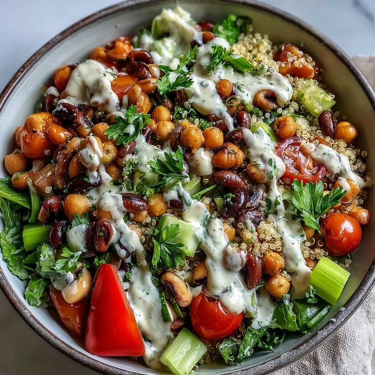 Save to Pinterest Start your year on a vibrant and nutritious note with this New Years Hoppin John Salad. This protein-rich dish is a fresh, modern take on the beloved Southern classic, combining traditional black-eyed peas with chickpeas and a medley of crisp vegetables. Bathed in a creamy, homemade tahini dressing, it is the perfect meal for those seeking a healthy and auspicious beginning to the new year.