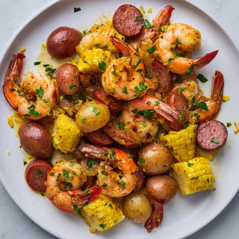 Save to Pinterest A festive, all-in-one seafood dish featuring succulent shrimp, smoky sausage, tender potatoes, and sweet corn, all roasted together and finished with bright lemon butter—perfect for a New Years Eve crowd.