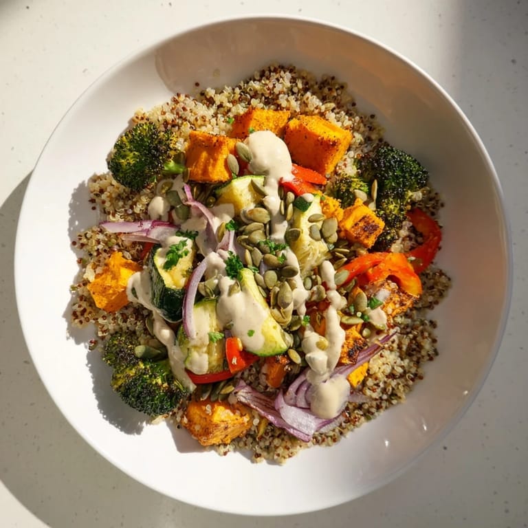 Save to Pinterest A vibrant healthy bowl featuring nutty quinoa and a medley of roasted seasonal vegetables topped with a zesty lemon-tahini dressing. Perfect for meal prep or a light lunch.
