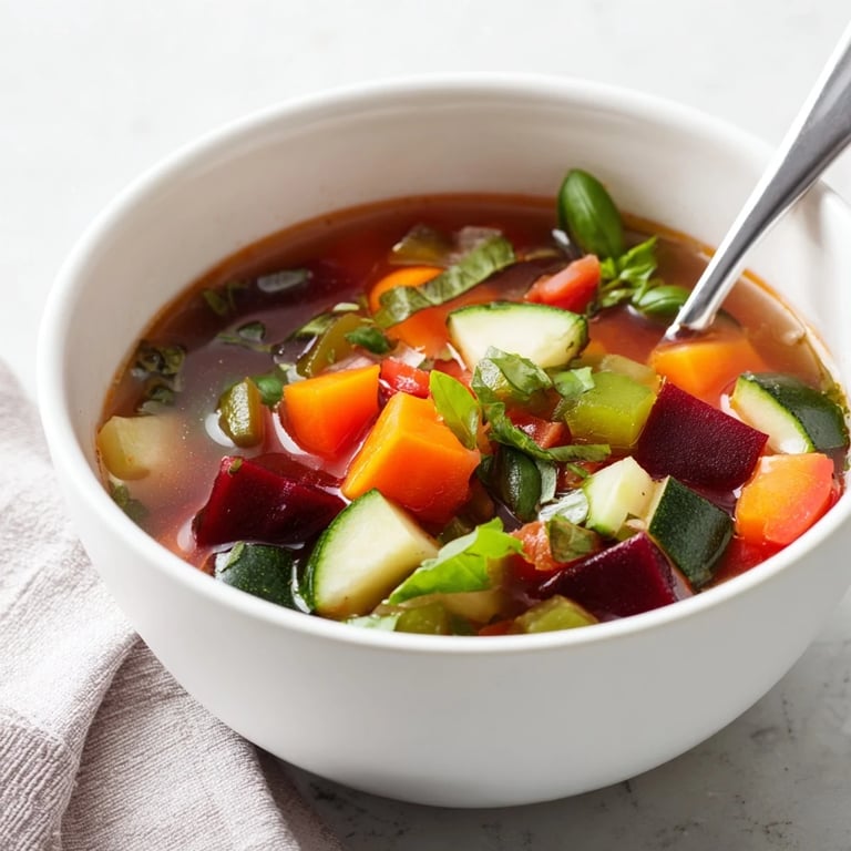 This vibrant detox soup combines beetroot, carrots, courgette, tomatoes, and bell peppers in a savory vegetable broth base. Fresh herbs like parsley, dill, and basil add aromatic depth, while lemon juice brightens the flavors. Sauté aromatics, add vegetables in stages, simmer until tender, then finish with herbs and seasonings. Ready in under an hour, this vegan and gluten-free soup serves four and pairs beautifully with whole-grain bread. Customize with lentils for protein or blend partially for a creamier texture.