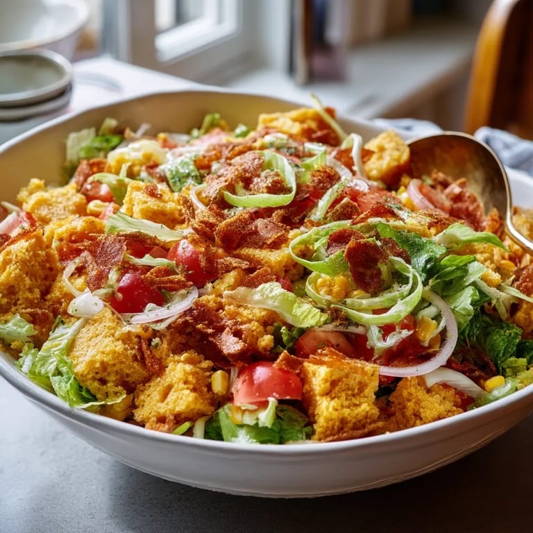 Cornbread salad has deep roots in Southern American cuisine where resourceful cooks transformed leftover cornbread into new meals. This modern version pays homage to traditional Southern cooking while incorporating fresh produce typical of summer gardens. The dish reflects the practical Southern approach to cooking where nothing goes to waste and simple ingredients transform into memorable meals. Particularly popular at church potlucks and family reunions across the American South this dish represents community and sharing.