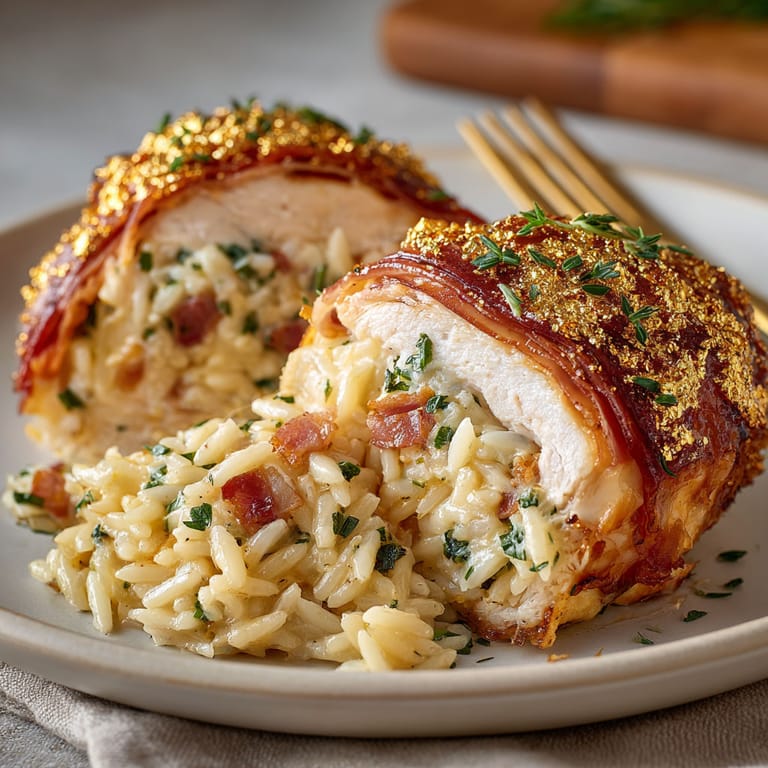 Chicken roulades are a classic in French and Italian kitchens often filled with local cheeses meats or vegetables The orzo twist brings Mediterranean comfort and the edible gold calls back to baroque feasts where glittering food was a status symbol