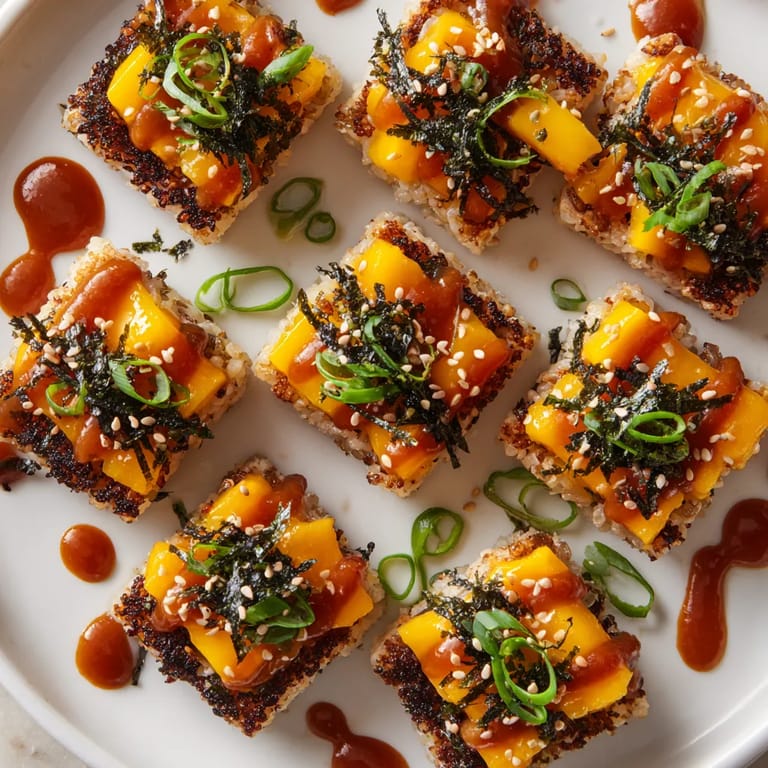 Save to Pinterest These swicy mango crispy-rice sushi bites are my go-to when I want something fun and colorful that never fails to impress guests. Each bite balances crispy rice with juicy sweet mango and a spicy Korean-inspired drizzle for an appetizer that brings plenty of personality to the table.