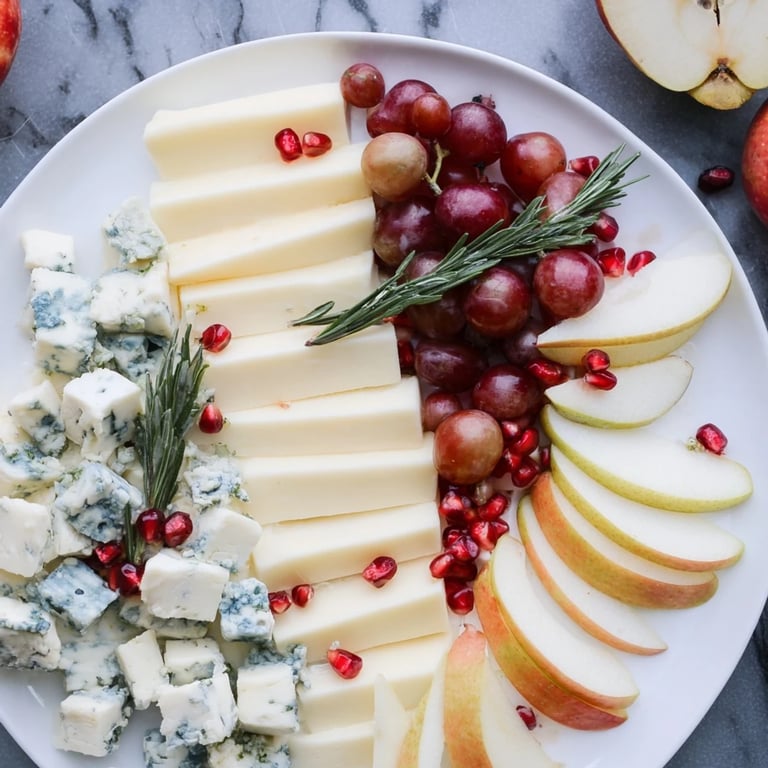 This festive snack board brings together an enticing combination of creamy brie, aged cheddar, and blue cheeses paired with crisp apples, ripe pears, and juicy grapes. Dried cranberries, apricots, candied pecans, and toasted walnuts add texture and warmth. Complemented by assorted crackers, baguette slices, white chocolate bark, and gingerbread cookies, the board is garnished with fresh rosemary and pomegranate seeds to create a visually appealing, flavorful spread perfect for winter gatherings or cozy nights by the fire.