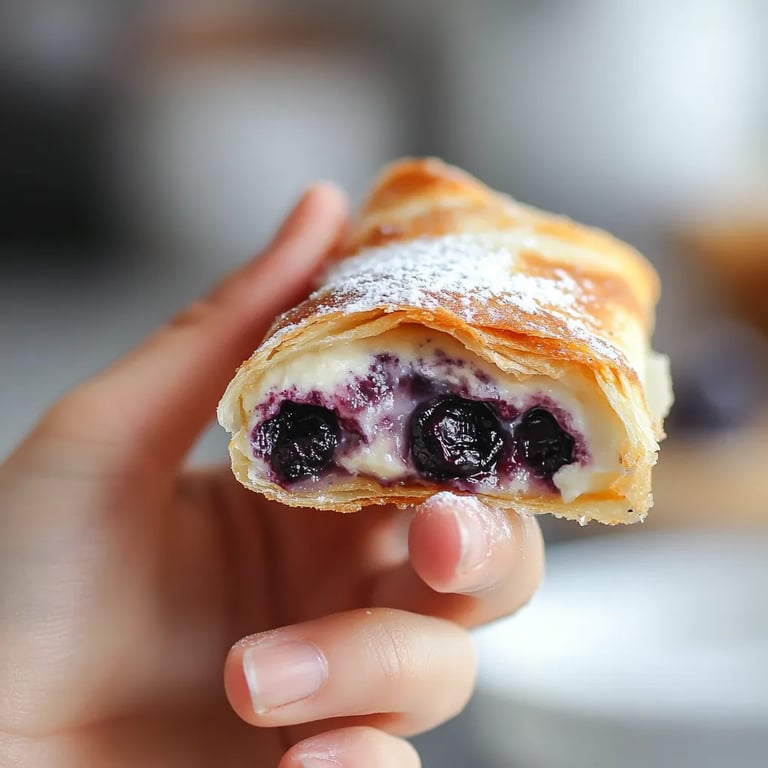 Save to Pinterest This decadent blueberry cream cheese egg roll recipe transforms a traditionally savory wrapper into a delightful dessert experience. The contrast between the crispy exterior and the creamy blueberry filling creates an irresistible treat that bridges the gap between cheesecake and pastry.