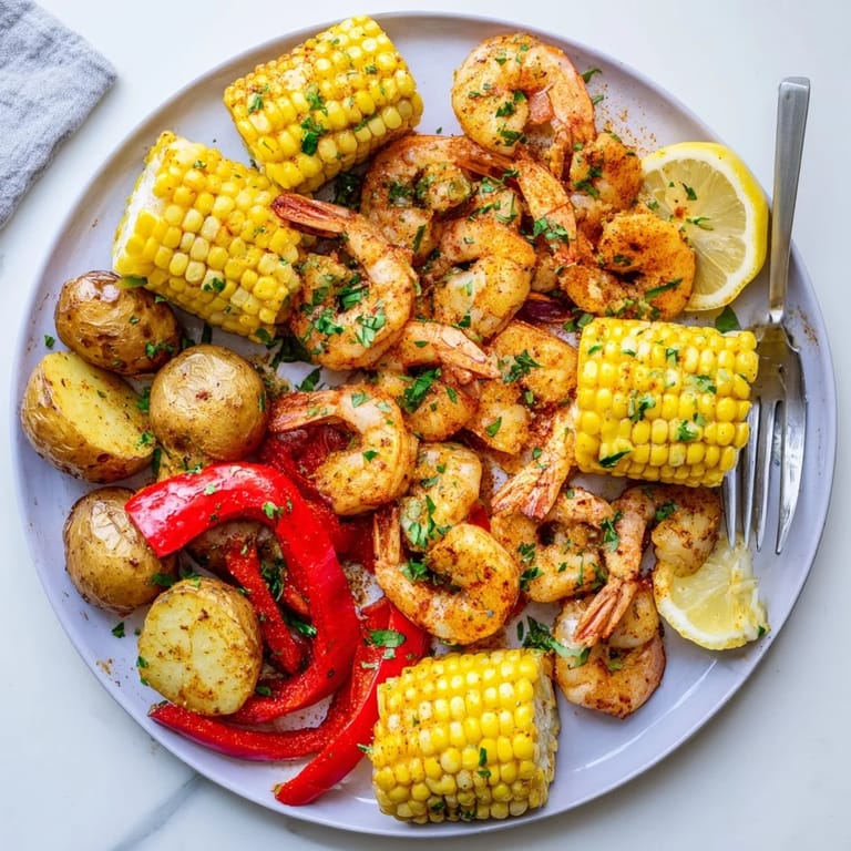 Save to Pinterest A vibrant, flavor-packed platter featuring spicy Cajun shrimp, sweet corn on the cob, and roasted potatoes, perfect for a festive meal or summer gathering.