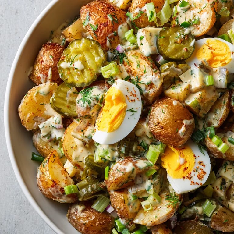 Save to Pinterest Crunchy golden potatoes get tossed in a creamy dressing with eggs, celery, and pickles for a potato salad that always draws a crowd. Swapping boiled potatoes for roasted gives this dish extra flavor and texture something I return to every picnic season because it wins over everyone at the table.