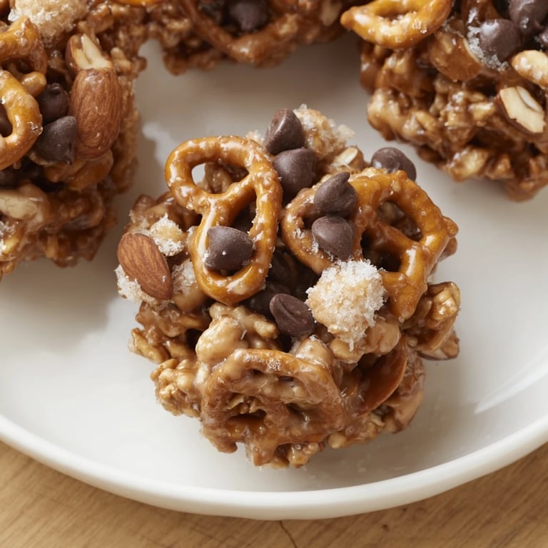Contains tree nuts (almonds), peanuts, dairy (butter), gluten (pretzels, cereal). May contain soy check chocolate chips and cereal labels. Always verify ingredient labels for hidden allergens.