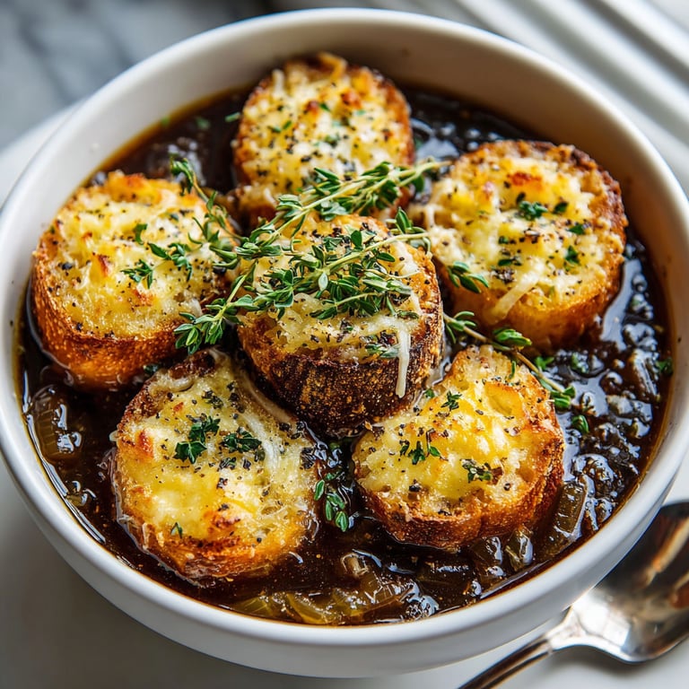 Save to Pinterest This comforting French onion soup transforms simple onions into a restaurant-worthy bowl of savory goodness. Deeply caramelized onions are simmered in hearty broth, then topped with crisp baguette croutons blanketed in bubbling Gruyere—the ultimate cold day remedy.