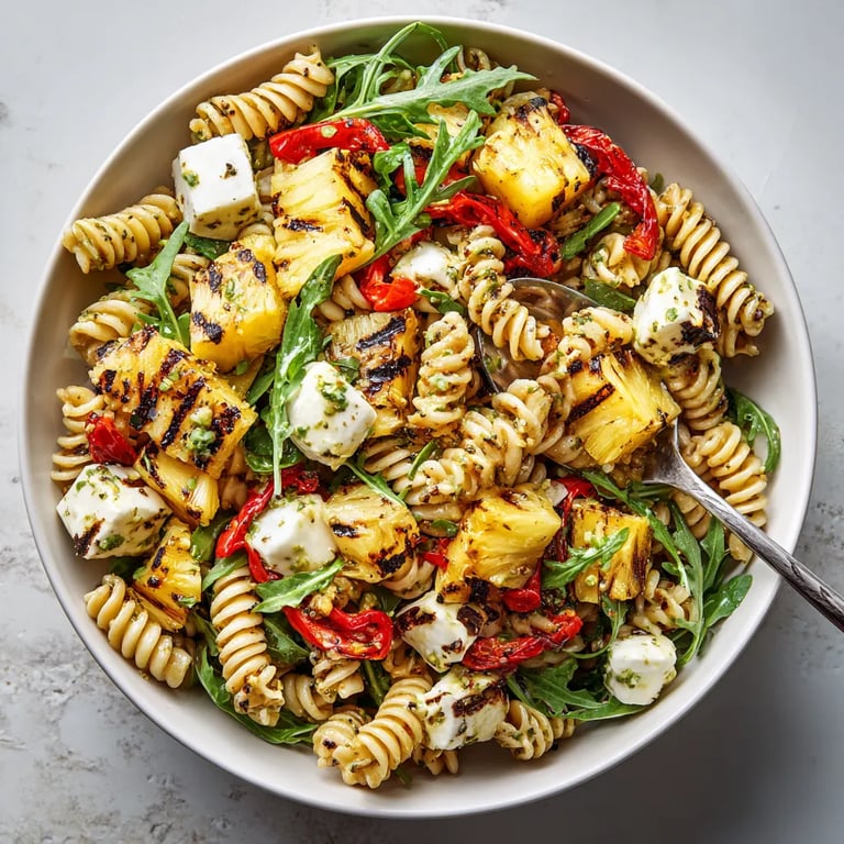 Save to Pinterest Bring sunshine to your table with this Grilled Pineapple Pasta Salad with Jalapeño-Lime Dressing This recipe layers smoky caramelized pineapple with cool mozzarella peppery greens and a bright zesty dressing making every bite burst with summer flavors I love pulling this out for picnics and cookouts—there is always someone coming back for seconds