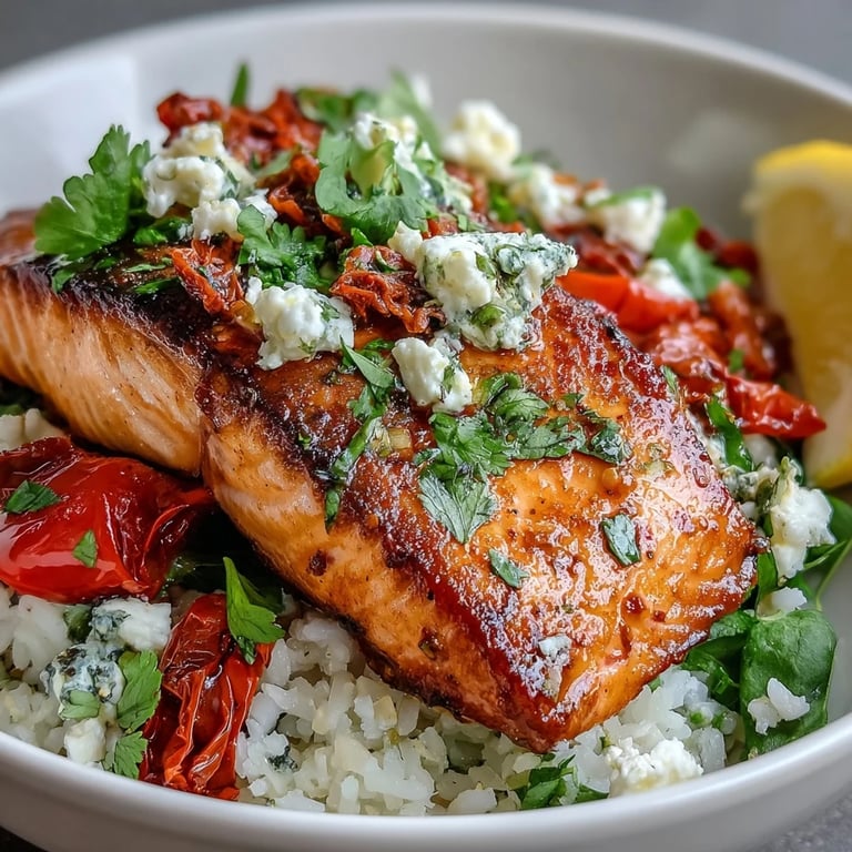 Save to Pinterest This Mediterranean Salmon Bowl is a vibrant and wholesome meal that brings a burst of coastal flavors right to your dinner table. Featuring perfectly pan-seared salmon with crispy skin and a bed of golden, crunchy rice, it is a delightful combination of textures and fresh ingredients like sun-dried tomatoes and creamy feta cheese.