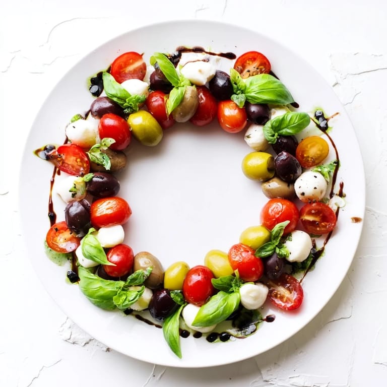 Save to Pinterest A festive and colorful appetizer featuring olives, cherry tomatoes, and fresh herbs, arranged in a beautiful wreath shape perfect for entertaining and holiday gatherings.