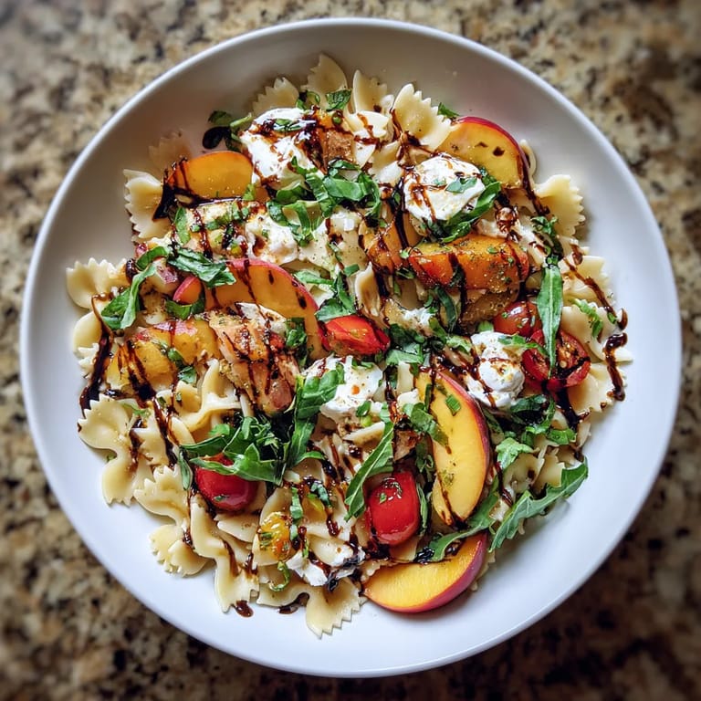 Save to Pinterest Sweet summer peaches and creamy burrata make this pasta salad sing with fresh flavors and color. Tossed with juicy cherry tomatoes, a generous heap of peppery arugula, and bright basil, everything gets balanced with a tangy balsamic honey drizzle. It is my go-to for warm evenings and gatherings that call for a dish as beautiful as it is delicious.