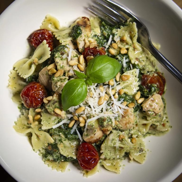 Save to Pinterest A vibrant, flavorful pasta dish featuring tender chicken, bowtie pasta, and a creamy basil pesto sauce—perfect for a quick weeknight dinner.