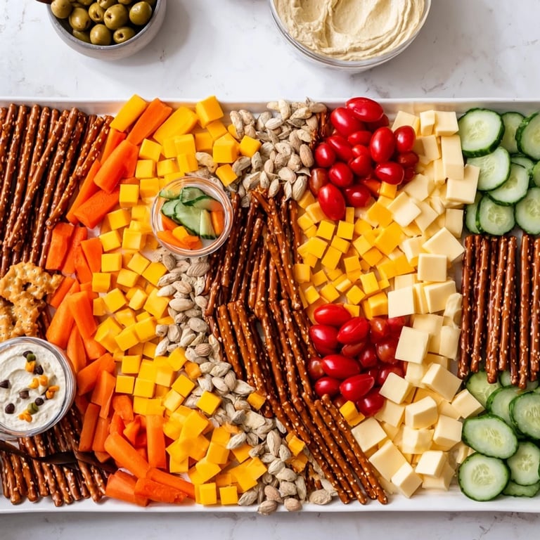 - In each section created by the pretzel grid, arrange one ingredient type so each block is different from its neighbors—this creates visual rhythm and lets people see all their options at a glance. Keep dips in small bowls so they don't soak everything around them.